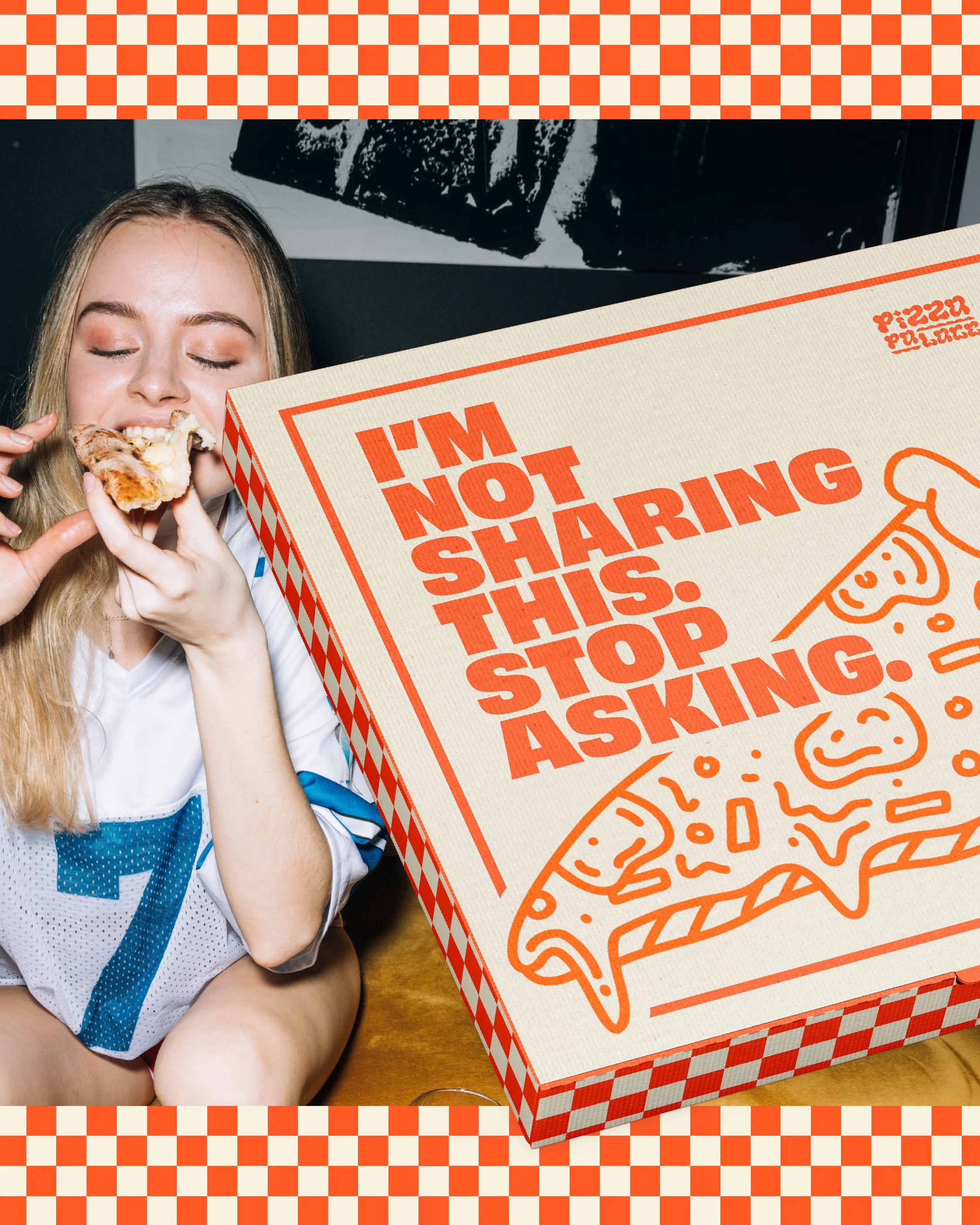 Pizza Palace is a pizza place that sells one-person-portion pizzas only. The whole brand idea is playing on the idea of someone not willing to share a slice of pizza with anyone. With a younger and fun-loving audience in mind, Pizza Palace has a very bold brand voice. The brand voice is so strong that it delivers the message and dictates all other design choices.